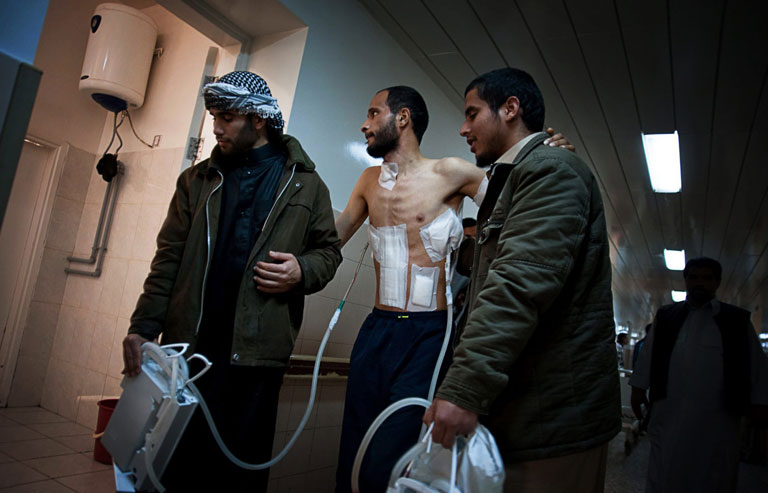 Die Luft stößt aus dem Rachen von Abdul Essa El-Mohoshhash, sie entweicht ihm mit einem Zischen. Ein Arzt drückt die überkreuzten Handballen auf den Brustkorb des 20-Jährigen, Stoß für Stoß, im Sekundentakt, immer wieder, seit einigen Minuten, bis er nicht mehr kann. Bis er mit Schweiß auf der Stirn aufgibt, selber außer Atem, und ein anderer Arzt auf die Brust von Abdul zu schlagen beginnt. Das Zischen aus Abduls Lungen mischt sich in das Klingeln und Surren der Überwachungsinstrumente auf der Intensivstation des Zentralkrankenhauses in Bengasi. In den Betten liegen die Verwundeten aus den Kämpfen der letzten Tage. Es ragen Schläuche und Kanülen aus ihnen, die meisten sind bewusstlos, bei manchen zucken ganz leicht die Fingerspitzen.