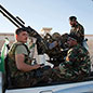 Es ist eine heikle Situation, selbst Anwar ist nervös, „das ist nicht gut“, sagt er, Abu Anas lacht alles weg, er drückt die PKK-Abgesandten, nimmt sie in den Arm. Er hat seinen Checkpoint angewiesen, nur zwei der zehn Fahrzeuge in die Stadt zu lassen. Zum ersten Mal nach Ausbruch der Kämpfe sind PKK-Kämpfer in Azaz. In einem Klassenzimmer der Schule sitzen sie dann im Kreis. Abu Anas versucht, aufzuklären. Die Kurden verdächtigen anfangs die FSA. Dann, nach wenigen Minuten, setzt plötzlich wieder Beschuss ein. Über der Stadt kreist ein Hubschrauber der syrischen Luftwaffe, er feuert mit Raketen und schwerem Maschinengewehr in die Straßen. Und mit einem Mal bekämpfen Kurden und FSA gemeinsam den Angreifer. Abu Anas läuft hinauf auf das Dach und schießt mit seinem Maschinengewehr. Im Erdgeschoss, in der offenen Tür, stehen PKK-Schützen und feuern ebenfalls. Das ganze Gebäude dröhnt vielfach vom Widerhall.