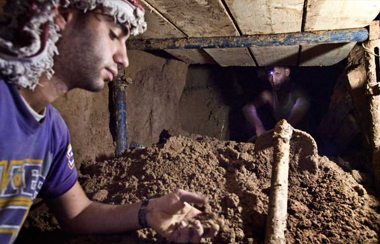 Es gelingt Abel und Ibrahim, die Stollendecke zu stabilisieren. „Du Hurentochter!“, brüllt Ibrahim die niederprasselnde Erde an. „Halt endlich dein verdammtes Maul!“ Sie lösen sich aus ihrer Starre, spannen zusätzliche Holzpfeiler zwischen Decke und Boden. Schreien sich Flüche und Arbeitsanweisungen zu. Vor einer Woche ist an dieser Stelle der Tunnel auf einer Länge von sechs Metern eingebrochen. Plötzlich, um drei Uhr in der Nacht. Ein Jahr lang hatten sie sich nach Ägypten vorgegraben, unter den drei Grenzmauern hindurch, 900 Meter weit, als auf offener Strecke die Decke nachgab. Das wirft ihren Zeitplan durcheinander, längst hat der Besitzer den Tunnel in Betrieb nehmen wollen. Ihm geht allmählich das Kapital aus. Er kauft nur noch billigste Materialen, klagt Ibrahim. Feuchtes Holz, die Reste schon einmal gesplitterter Balken. Die beiden schaffen es, einen neuen Eisenträger aufzustellen. Die Erde kommt zur Ruhe. Das Prasseln über ihnen lässt nach. „Wir kriegen das in den Griff,“ sagt Ibrahim irgendwann, barfuß, in Unterhemd und aufgekrempelter Trainingshose. Er lacht, steckt sich eine Zigarette an, kurz bevor die Seitenwand abkippt und ihn unter sich begräbt.
