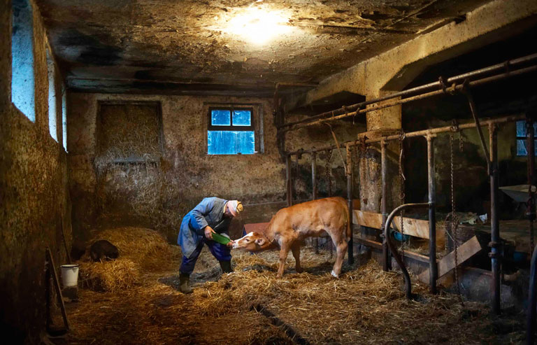 Die Neonröhre flackert und verlischt, flackert erneut und wirft gleißendes Weiß auf Kühltank und Melkmaschinen. Die Arbeit beginnt ohne Worte. Anneliese sieht nach den Kälbern, so, wie sie es in den letzten 60 Jahren getan hat. Vater und Sohn drücken sich je ein Melkgestänge an den Körper. Rolf kümmert sich um die schwierigeren Tiere, die angekettet gerne mal auskeilen, kniet unter ihnen, massiert die Zitzen, stützt den Kopf an ihren Bäuchen. Melken ist Nahkampf, zweimal täglich, ein hartes Schieben und Drängen. Es spritzt zwischen den Tierleibern, der Urin in Sturzbächen, ausquellender Kot und Milch, wenn die Saugstutzen nicht glatt aufsitzen. Zu diesem Zeitpunkt besitzen Breuningers noch 29 Kühe, das sind sieben weniger als vor einem Jahr. Ihre Zahl verringert Rolf nur allmählich, das letzte Heu will er verfüttern, die letzten Kälber geboren bekommen. Die Sparsamkeit bewahrt er sich bis zum Schluss. Das ist die eine Wahrheit. Die andere ist, die Breningers sehnen das Ende nicht herbei.