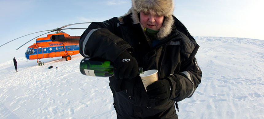 Die Chinesen in den roten "Vicaar"-Jacken beginnen, nervös zu werden, als Alan Chambers sie zu den Helikoptern führt. "Alan", rufen sie ihm zu, "meine Schneebrille beschlägt!" "Alan", klagen sie, "die Skibindung drückt." Einer von ihnen kann nach nur wenigen Metern aus Erschöpfung kaum mehr seinen Schlitten ziehen. Der Brite herrscht sie an, die Fabrikbesitzer und Hegde-Fonds-Direktoren schweigen demütigt; diese Reise steht unter keinem guten Stern. Nacheinander lässt Stationsleiter Victor Boyarski die Gruppen hinaus aufs Eis fliegen, mit zwei sibirischen Hubschraubern, die sonst Ersatzteile für Gaspipelines transportieren. Eine Karte an der Kantinenwand zeigt täglich neu die Positionen der Teams, darunter auch ein schweizerisch-deutsches. Nur zwei werden ihr Ziel zu Fuß erreichen. Zu stark ist die Meeresströmung, die das Polareis in diesen Tagen Richtung Süden treibt. Für einige wartet die schwerste Herausforderung, wenn sie nach ihrem Rücktransport in Barneo in der Kantine sitzen: das Scheitern zu verkraften.
