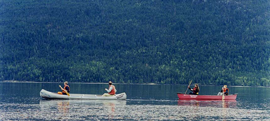 Zwölf Monate nach ihrer Ankunft. 97 Prozent der Deutschen ist überzeugt, dass seit Jahresbeginn mit dem Euro alles teuer geworden ist, die Union liegt in Umfragen weit vor der SPD. In British Columbia riecht die Luft wie Badeöl. Fichte intensiv. Das Wasser des „49 Creek“ dröhnt zwischen den Klammwänden. Hanna ruft sich heiser nach Sheila, der Retriever-Hündin, die plötzlich den Hang hochjagt. Auf einem schmalen Pfad führt Hanna den Hund aus, an den Stromschnellen entlang, wie immer frühmorgens vor der Arbeit. „So ganz ohne ist das hier nicht. Ich weiß nicht, ob uns in diesem Lärm die Bären hören.“ Sie wohnen weit oben in den Berghängen, über denen nur noch Wald ist, Wildnis und Kojotengebell. „Ich habe mich zuerst nicht weiter als einen Kilometer vom Haus weggetraut. Aber allmählich fühle ich mich sicherer.“ Sheila beendet ihren Privatausflug, sie gehen zum Haus zurück, Shasheen Road, Blick über das Tal des Kootenay, weites Land in Moosgrün, wunderschön, und Regen jetzt, Regen seit Tagen.