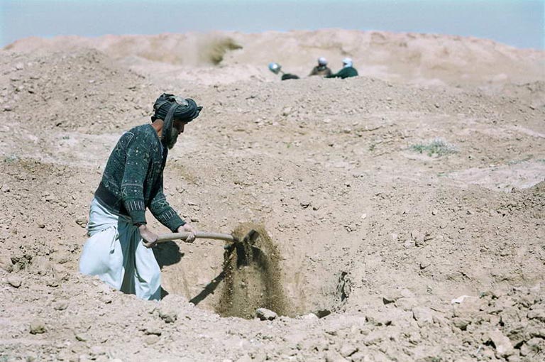 Der jüngere Zakir, der es satt hat zu graben, die Drecksarbeit zu erledigen, hat es einmal versucht, sich aus der Fessel der Händler zu lösen. Er erzählt es während der Mittagspause, bei Tee aus Thermoskannen und Trockenbrot. „Es war der beste Fund, den ich in diesem Jahr gemacht hatte: eine goldene Gürtelschnalle mit blauem Edelstein.“ Die Händler in Mazar-il-Sharif boten ihm 2000 Dollar. Er ging von Laden zu Laden, fuhr von Stadt zu Stadt, fuhr durch ganz Afghanistan, fuhr bis nach Pakistan, doch überall boten sie ihm 2000 Dollar. „Die haben sich gegenseitig angerufen, die kennen alle einander.“ Zakir kehrte zurück und ließ sich in Mazar-il-Sharif vom ersten Händler die 2000 Dollar geben. „Du hast keine Chance“, sagt er. „Es gibt keinen Ausweg.“