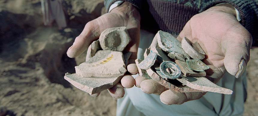 Das Fleisch der Toten, das zu Staub wurde, brennt auf der Haut. Es klebt in den Augen. Mit jedem Atemzug weht es durch die Zähne, der Wind bläst es in den Rachen, in die Lunge, tief hinunter, wo es sticht, wenn Abdul Qahar sie hinauf zu würgen versucht. Wenn er spuckend und röchelnd in der Grube kniet und die Ahnen verflucht, in deren Staub er wühlt. Schaufel für Schaufel hat der 48-Jährige in den Wind geschlagen, in rauchigen Fahnen weht Erde übers Land. „Es ist Gift in diesem Sand“, sagt er. Mit zerrissenen Fingernägeln durchkämmt er den Dreck. Seine Hände walken ihn. Er melkt die Erde, angespannt und konzentriert, so wie ein Verdurstender einer alten Ziege den letzten Tropfen abringt. Eine Scherbe bleibt zwischen den Fingern hängen. Er wirft sie achtlos über den Grubenrand, wo Scherben in Massen liegen, sie den Grund bedecken wie Pflastersteine, prachtvoll bemalt, in allen Farben, mit rätselhaften Schriftzügen und Symbolen. Tiefer gräbt Abdul Qahar, ein Mann mit klugen blauen Augen, der weiß, was er tut. Der inständig hofft, heute wie morgen und dann erneut den Tag darauf: Dass er endlich erlöst wird von den Toten.