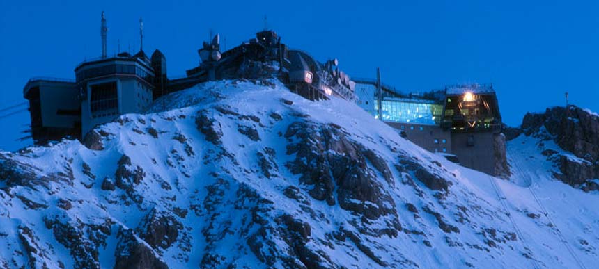 Die Zugspitze ist Deutschland in Taschenformat, ein paar Quadratmeter Fels, auf denen sich bunteste Gegensätze tummeln. Das Gipfeldorf besteht aus drei Ortsteilen: den Bars, Panoramarestaurants, Kinos und Kunstausstellungen auf Feldmeiers Grat. Dem „Sonn Alpin“, 400 Höhenmeter tiefer, mit unterirdischem Zahnradbahnhof und Ski-Gaudi auf dem Gletscher. Und schließlich dem Schneefernerhaus, 300 Meter unter dem Gipfel, ehemals Nobelherberge, heute Stützpunkt von Naturwissenschaftlern aus der ganzen Welt. Alle sind durch separate Seilbahnen miteinander verbunden. Dennoch bleiben die Abteilungen meist unter sich. Die Zugspitzler kennen sich, aber nur vom Sehen.