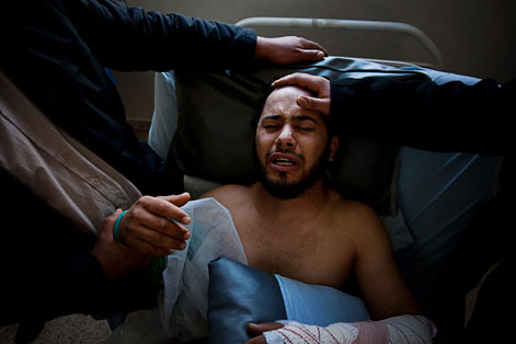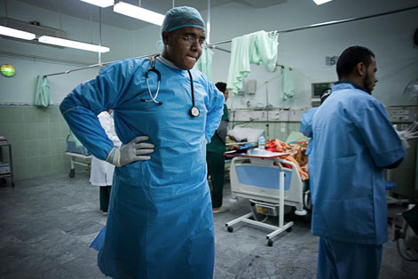 Die Luft stößt aus dem Rachen von Abdul Essa El-Mohoshhash, sie entweicht ihm mit einem Zischen. Ein Arzt drückt die überkreuzten Handballen auf den Brustkorb des 20-Jährigen, Stoß für Stoß, im Sekundentakt, immer wieder, seit einigen Minuten, bis er nicht mehr kann. Bis er mit Schweiß auf der Stirn aufgibt, selber außer Atem, und ein anderer Arzt auf die Brust von Abdul zu schlagen beginnt. Das Zischen aus Abduls Lungen mischt sich in das Klingeln und Surren der Überwachungsinstrumente auf der Intensivstation des Zentralkrankenhauses in Bengasi. In den Betten liegen die Verwundeten aus den Kämpfen der letzten Tage. Es ragen Schläuche und Kanülen aus ihnen, die meisten sind bewusstlos, bei manchen zucken ganz leicht die Fingerspitzen.