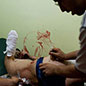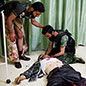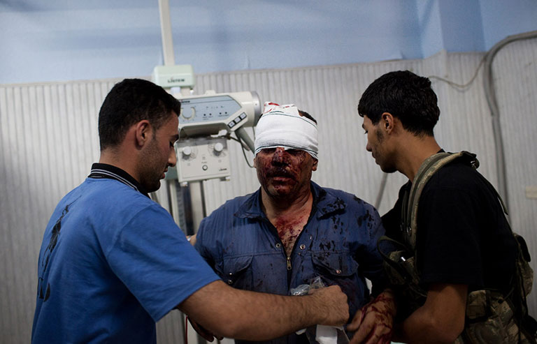 Der Beschuss wird nach Einbruch der Dunkelheit intensiver, in der Nähe des Medienzentrums verletzt eine Rakete zwei Brüder, zehn und elf Jahre alt. Ich treffe sie im Behandlungsraum der Klinik. Der eine kauert auf einem Hocker, der andere auf einer Trage. Metallsplitter in den Armen und Beinen, aber zum Glück nicht tief. Unter Schock stieren beide in den Raum. Fast alle der zwölf Ärzte, die bis zum Ausbruch der Kämpfe in der Klinik arbeiteten, sind geflohen, nur einer nicht. Er hat seit Tagen nicht mehr richtig geschlafen, Schweiß auf der Stirn, Blut auf dem Kittel. Blut ist überall, Blut dieser Nacht, Blut der Tage davor, an den Wänden, in einzelnen Spritzern und schlierigen Bahnen. Ein 14-Jähriger wird eingeliefert, das linke Bein zerfetzt, Granatsplitter im Rücken. Eine halbe Stunde müht sich der Arzt, den Blutverlust zu stoppen, den Kreislauf zu stabilisieren. Diese Klinik in Azaz ist die einzige funktionierende nördlich von Aleppo. „Wir können nur Erste Hilfe leisten“, sagt der Arzt, dessen Name nicht genannt werden soll. Seine Familie lebt noch im Einflussbereich der Regierung. Er hat Angst, dass sie verhaftet wird, so wie es in diesem Krieg vielen Familien von Ärzten erging, die auf der Seite der Opposition Verletzte behandelten.