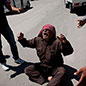 Ahmed, der Mann mit Downsyndrom, setzt sich auf den Boden und ahmt das Tippen einer Laptop-Tastatur nach. Ein FSA-Kämpfer zielt aus Langeweile mit einer Kalaschnikow auf ihn, Ahmed hat keine Angst, grient die Aktivistenrunde. Doch Ahmed duckt sich weg. Er bedeckt den Kopf mit einer Hand. Sie geben Ahmed die Waffe, er richtet den Lauf auf den einen, auf den anderen, dann bemerken sie, dass das Gewehr entsichert ist. Rasch nimmt Anwar ihn die Waffe ab.