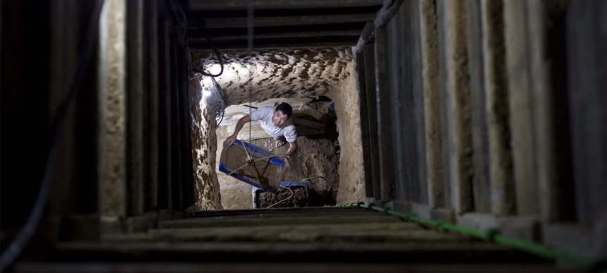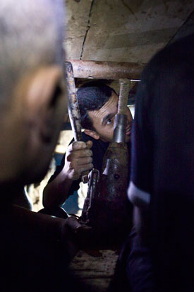 Der erste Balken bricht. Nasir kann mit dem Kopf ausweichen. Zu dünn sind die Bretter, schimpfen sie. Die Erde sackt immer noch ab. Zehn Meter über ihnen liegt auf ägyptischer Seite ein Olivenhain, und der Bauer hat neulich begonnen, ihn überreichlich zu wässern. „Dieses Schwein!“, flucht Nasir. Fünf Tunnel haben durch diesen Bauern Probleme mit aufgeweichten Decken. Die Schmuggler boten ihm Geld, wenn er das Bewässern lasse, zunächst 5000 Dollar, dann 10 000 Dollar. Er verlangte 16 000 Dollar, die gaben sie ihm. Sie bezahlten ihn sogar die Umsetzung des Wassertanks. Er pumpt immer noch Wasser in die Oliven.