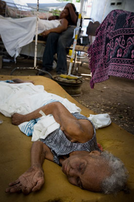 Das Ehepaar, das Foto des Kindes in der Tasche, irrt durch die staubenden Trümmer dieser Stadt. Zuhause sitzen sie im Hof unter einer aufgespannten Plane. Das Radio spielt tröstende Gospelmusik. Die Mutter hat sich wieder etwas gefasst. Sie erzählt, wie sie am Morgen vor dem Beben ihrer Tochter das Frühstück machte. Sie, die fast immer gute Laune hatte, es liebte, zu reden und zu plaudern, war missgestimmt. Kopfschmerzen habe Manu gehabt. Wortlos hätten sie am Tisch gesessen, bevor sie für immer ging. Der Mann, der Manu demnächst heiraten wollte, schließt die Hände um sein Gesicht."Ich fühle mich so schuldig", sagt er. Ein Arzt, den Manu in einer Arbeitspause im Park in Port-au-Prince kennen lernte. Sie hatte Apothekenhelferin gelernt, doch ihr neuer Freund überredete sie, zusätzlich eine Krankenpflegeausbildung zu absolvieren. Weshalb sie beim Beben in der Berufsschule war. "Ich weiß nicht, was ich jetzt machen soll", weint er in seine Hände. "Ich habe sie geliebt." Die Palmen wehen über ihren Köpfen. Um ihre Beine wedelt "Chiot", Manus zwei Monate alter Welpe. Das Bett hat die Mutter abgebaut und in den Rohbau gestellt, in den ihre Tochter nach ihrer Hochzeit ziehen wollte. Das hatte ihr eine alte Nachbarin geraten. "Stell es dorthin, wo du es nicht sehen kannst. Stell es aufrecht an die Wand." Damit der Geist der Tochter sich nicht mehr niederlassen und er leichter gehen kann.