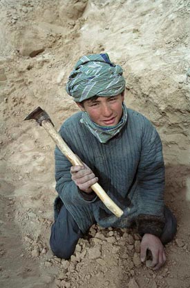 Der jüngere Zakir, der es satt hat zu graben, die Drecksarbeit zu erledigen, hat es einmal versucht, sich aus der Fessel der Händler zu lösen. Er erzählt es während der Mittagspause, bei Tee aus Thermoskannen und Trockenbrot. „Es war der beste Fund, den ich in diesem Jahr gemacht hatte: eine goldene Gürtelschnalle mit blauem Edelstein.“ Die Händler in Mazar-il-Sharif boten ihm 2000 Dollar. Er ging von Laden zu Laden, fuhr von Stadt zu Stadt, fuhr durch ganz Afghanistan, fuhr bis nach Pakistan, doch überall boten sie ihm 2000 Dollar. „Die haben sich gegenseitig angerufen, die kennen alle einander.“ Zakir kehrte zurück und ließ sich in Mazar-il-Sharif vom ersten Händler die 2000 Dollar geben. „Du hast keine Chance“, sagt er. „Es gibt keinen Ausweg.“