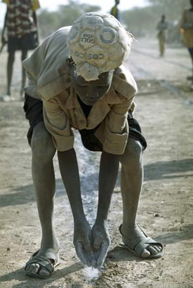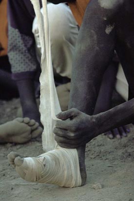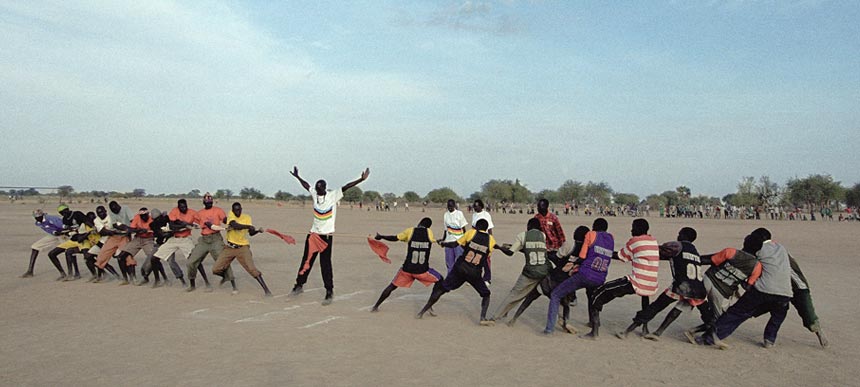 Gespielt, geworfen und gerannt wird, wenn der Hitzschlag nicht sofort droht, morgens und nachmittags. Bis zu 45 Grad brennen auf den Sand. Die Sportler dösen tagsüber in „olympischen Dörfern“, kleinen Komplexen aus Lehmrundhütten, vor denen die Mannschaften auf Bastmatten schlafen. Im Schatten eines Baumes hält der Fußballcoach von Wunrok Lagebesprechung mit seinem Team. Im Finale werden sie auf Turalei treffen. „Wir spielen dieses Mal mit einem Lederball. Da ist Luft drin, Jungs. Der verhält sich anders als unsere Bälle.“ Wunroks Bälle sind meist aus alten Socken und mit Lumpen gefüllt. Die Spieler lauschen seinem Vortrag konzentriert. Alle aus Wunrok sind sie gegen das Verbot ihrer Stadt hierhergekommen. 150 Blockadebrecher. Wunrok lag noch vor drei Jahren mit den Nachbarkreisen im Krieg. Der Konflikt köchelt weiter. Jetzt, zu den Spielen, müht sich die Jugend, die alten Gräben zu überwinden. „Wir sind die beste Mannschaft und wollen das beweisen!“ Das ist der Sportgeist, den Acuil Banggol heraufbeschwört: Solange sie spielen, schießen sie nicht.