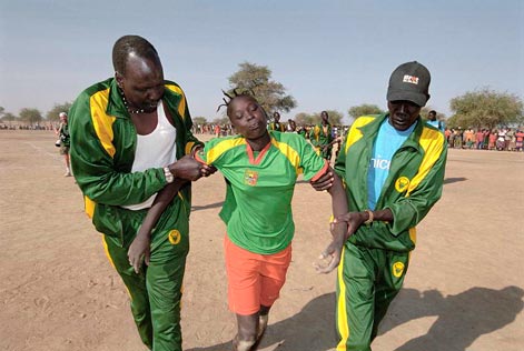Dieses Olympia ist auf keiner Karte verzeichnet. Die Arena, zu der die Zuschauer strömen, zu Tausenden, zu Fuß, in tagelangen Märschen, ist ein planes Feld. Es besitzt die klassischen Abmessungen eines Leichtathletikstadions, Feigenbäume begrenzen es. Eine dicke Staubschicht liegt darauf, in ihr lauern Dornen auf die Olympioniken, zentimeterlang, die das Vorbereitungsteam da und dort übersah. Der leidige Zeitdruck. „Das war eine Plackerei!“ stöhnt Baustellenleiter Akel, beleibt, gemütlich und Banggols Ex-Trainer. „Ich habe sechs Monate meines Lebens geopfert. Ich wurde von einem halben Dutzend Skorpionen gestochen und höre jetzt nur Klagen!“ Schützengräben durchzogen den Athletenacker, vor drei Jahren noch Schlachtfeld, auf dem sich die Südrebellen untereinander bekriegten. Die Gräben mussten eingeebnet werden. Akel fällte Bäume, brannte Büsche ab, ließ Scheunen für die Vorräte errichten, alles von Hand.