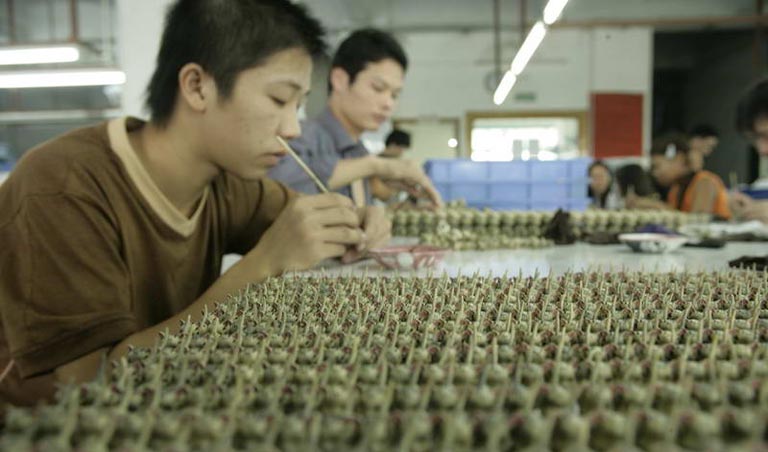 Kinder füllen die Lücken. „Sommerarbeiter“ heißen sie in Yus Fabrik, Zwölf- bis 16-Jährige, die in Klassenformationen mit ihren Lehrern anreisen. Die Personalabteilungen bevorzugen Mädchen, weil sie als gehorsamer und besser kontrollierbar gelten. Sie arbeiten während der Weihnachtsproduktion an den Fließbändern, vermietet von ihren Schulen, die die Hälfte des Lohnes als „Schulgebühr“ einbehalten. Da sie nicht als reguläre Arbeiter geführt werden, zahlt ihnen der Betrieb in der Regel ein Drittel weniger. Immer schon war Kinderarbeit in der Spielzeugindustrie ein Problem, nie aber war es so schlimm wie heute. Das berichten Arbeitsrechtsorganisationen in Hongkong. Viele Minderjährige schleichen sich mit gefälschten Dokumenten ein. Plätze und Bürgersteige in Guangdong sind zugekleistert mit Werbezetteln, auf denen Telefonnummern der örtlichen Dokumentenfälscher stehen. Die heute 17-jährige Li Ting (Name geändert) hatte es noch einfacher. „Als ich mit 16 eingestellt wurde, habe ich den Ausweis einer älteren Freundin gezeigt.“ Es gebe viele Minderjährige in ihrer Fabrik, ergänzen drei Kolleginnen, die sie zum Interview begleiten. Alle sind sie sehr unruhig bei diesen Treffen, in einem eigens dafür angemieteten Hotelzimmer, wo sie unbeobachtet sind, wo niemand sie belauschen kann. Sie riskieren hierbei weit mehr als nur ihren Job.