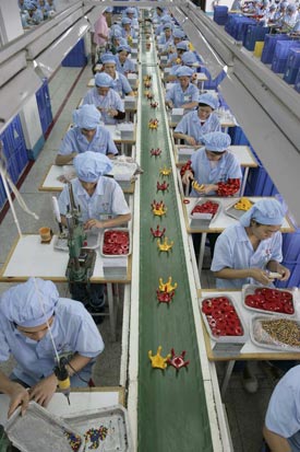 Die „Hölle“ nennen die Arbeiter die Fabrik, weil ihr Name dem chinesischen Schriftzeichen für Verdammnis ähnelt. Es heißt, sie sei die Schlimmste unter den großen Betrieben in der Stadt. „Ich habe Angst vor Morgen“, sagt Yu, der seine Hand seit vergangener Woche nicht mehr richtig bewegen kann. Entzündete Knöchel. Im achten Monat in Folge drückt er nun kleine Ersatzräder aus Plastik an die Rückseite eines Spielzeugjeeps und Stoßstangen an die Vorderseite. „Ich habe meinen Gruppenleiter gebeten, er soll mir eine andere Aufgabe zuteilen. Aber er hat abgelehnt.“ Wie lange die Marathonmaloche am Fließband dauert, erfahren sie meist erst im Laufe des Tages. Zur Hochsaison zwischen Juni und August, wenn sie für Weihnachten produzieren, sind es nicht selten 18 Stunden. Manchmal – bei Eilaufträgen – arbeiten sie die ganze Nacht. Drei Tage und Nächte Schufterei sind Yus persönlicher Rekord. Einen freien Tag gibt es selbst in der Nebensaison nur einmal im Monat. Der Verdienst – nach allen Abzügen für Kantine und Wohnheim – liegt im Schnitt bei 60 Euro. Und ständig ist er krank. Es gibt keinen Atemschutz, wenn sie Plastikfiguren lackieren. Giftige Schwaden von Lack und Lösungsmittel wabern durch den Raum. Die meisten Abteilungen sind ohne Klimaanlage, die Temperaturen werden im Sommer unerträglich. Fünfmal am Tag dürfen Frauen auf die Toilette, dreimal die Männer, für maximal fünf Minuten. Wer häufiger muss, zahlt Strafe, die vom Gehalt abgezogen wird.