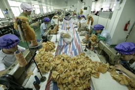 Polizisten sind mit Blaulicht zum Werkstor der „Hip Chun Toys Company“ geeilt, ein Zulieferer für Mattel und Hasbro. Aufgebrachte Schreie und Rufe hallen den Beamten entgegen. „Die geben uns Abfall zum Fressen!“ „Wir kriegen kein Geld! Die bescheißen uns beim Essen und bei der Bezahlung!“ 40 Arbeiter und Arbeiterinnen versammeln sich in strömenden Regen und demonstrieren. Die Wachleute der Firma eilen hinzu und fordern das ausländische Reporter-Team eindringlich zum Gehen auf. „Wenn ihr länger bleibt, wird die Situation eskalieren“, beschwört man uns. „Die schlagen dann alles zusammen.“ Zufällig hatte uns die „Hip Chun Toys“ an diesen Tag eine Betriebsbesichtigung erlaubt. Die absonderlichsten Geschöpfe erblicken im 2000-Mitarbeiter-Unternehmen das Licht der Welt, Spiderman für Disney, Hulk, die Horrorfigur Freddy Krueger, blutverschmierte, mordlustige Ekelplastik der Film- und Comic-Industrie. Auch nach Deutschland liefern die Monstermacher. Während im Werkshof der Protest im vollen Gange ist, zeigt der Firmenchef den Journalisten im Konferenzraum schöne Urkunden hinter Glas. Das Disney-Qualitätszertifikat. Das Hasbro-Gütesiegel. Die Bescheinigung des Weltspielzeugverbands ICTI über die vorbildliche Einhaltung von Sozialstandards. Die Demonstranten erwähnt der Direktor nicht.