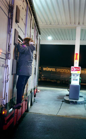 Iris Baumgärtner hat soeben den rechten Hinterreifen des LKWs bestiegen, Petra Kandzian den linken. Sie spähen durch die Lüftungsschlitze, notieren, was sie im Halbdunkeln des Wagens sehen, fotografieren, alles ganz hastig, klettern auf die vorderen Reifen, während ihnen der Schreihals in Truckersandalen entgegenstürmt.