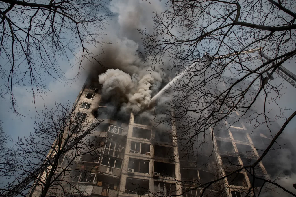 Ein Arzt, ein Fliesenleger, ein Werkzeugmacher. Sie sind die erste Schicht der Nachtwache, die die Bewohner der Wohnanlage vor einigen Tagen eingerichtet haben. Das Haus, in dem sie leben, 24 Stockwerke hoch, eine wuchtige Wand aus 400 Wohnwaben, ist einer der letzten Bauten am nördlichen Stadtrand von Kiew Hinter diesem Haus sind nur noch Wiesen und Wälder. Und irgendwo dort sind die Spitzen der russischen Truppen. Wo genau, wissen die Bewohner nicht. In der Ferne ist grollendes Artilleriefeuer zu hören.